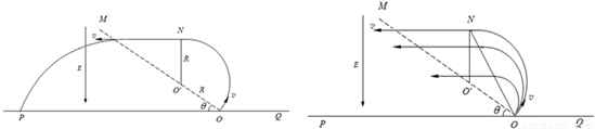 如图所示,在竖直平面内,虚线MO与水平线PQ相交于O,二者夹角θ=30°,在MO左侧存在电场强度为E、方向竖直向下的匀强电场,MO右侧某个区域存在磁感应强度为B、垂直纸面向里的匀强磁场,O点处在磁场的边界上,现有一群质量为m、电量为+q的带电粒子在纸面内以速度v(0≤v≤(1)速度最大的粒子从O开始射入磁场至返回水平线POQ所用的时间.