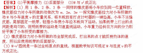 (3)若实验作了n次,所用橡皮条分别为1根、2根……n根,通过纸带求出小车的速度分别为v1、v2……vn,用W表示橡皮条对小车所做的功,作出的W—v2图线是一条过坐标原点的直线,这说明W与v2的关系是 。