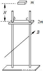 如图所示,间距为L、电阻为零的U形金属竖直轨道,固定放置在磁感应强度为B的匀强磁场中,磁场方向垂直纸面向里.竖直轨道上部套有一金属条bc,bc的电阻为R,质量为2m,可以在轨道上无摩擦滑动,开始时被卡环卡在竖直轨道上处于静止状态.在bc的正上方高H处,自由落下一质量为m的绝缘物体,物体落到金属条上与金属条发生碰撞,在碰撞之前的瞬间卡环立即释放,碰撞后两者一起继续下落;当金属条下落h时,恰好开始做匀速运动.设金属条与导轨的摩擦和接触电阻均忽略不计,竖直轨道足够长,重力加速度为g,求:(1)金属条开始下落时的加速度;