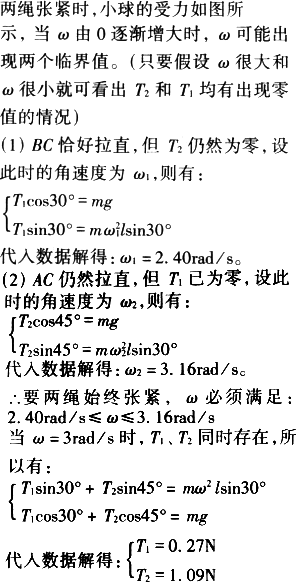 如图所示,两绳系一个质量为m=0.1 kg的小球,上面绳长l=2 m,两绳都拉直时与轴夹角分别为30°与45°,问球的角速度在什么范围内两绳始终张紧?当角速度为3 rad/s时上、下两绳拉力分别为多少?