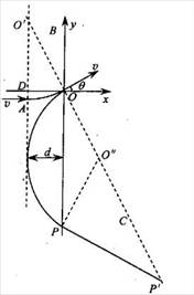 (1)设磁场左边界与x轴相交于D点,与CO相交于O´点,由几何关系可知,直线OO´与粒子过O点的速度v垂直。在直角三角形OO´D中∠OO´D=30º。设磁场左右边界间距为d,则O O´=2d。依题意可知,粒子第一次进入磁场的运动轨迹的圆心即为O´点,圆弧轨迹所对的圆心角为30º,且O´A为圆弧的半径R。