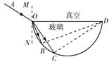 解:①红光的折射率小,频率小,波长大.进入玻璃后红光偏折得少,故OC光为红光,故λB<λC(2分)