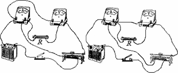 R的阻值,每组器材中包括:电池,电键,变阻器,电压表,电流表,等测电阻R,若干导线.(1)如果待测电阻R的阻值比电压表的内阻不是小很多,但R的阻值比电流表的内阻大很多,试在图甲中连线使之成为测量电路;如果待测电阻R的阻值比电流表的内阻不是大很多,但R的阻值比电压表的内阻小很多,试在图乙中连线使之成为测量电路.