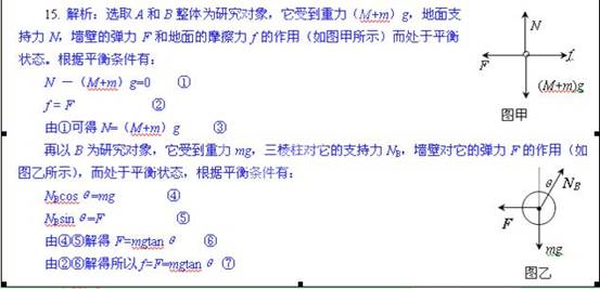 如图所示,质量为M的直角三棱柱A放在水平地面上,三棱柱的斜面是光滑的,且斜面倾角为θ。质量为m的光滑球放在三棱柱和光滑竖直墙壁之间,A和B都处于静止状态。求地面对三棱柱的支持力和摩擦力。(要画受力分析图)