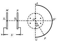 ÈçͼËùʾ£¬M¡¢NÊÇÊúÖ±Õý¶Ô·ÅÖõÄÁ½¸öƽÐнðÊô°å£¬S1¡¢S2ÊÇM¡¢N°åÉϵÄÁ½¸öС¿×£»N°åµÄÓÒ²àÓÐÒ»¸öÔÚÊúÖ±ÃæÄÚ£¬ÒÔOΪԲÐĵÄÔ²ÐÎÇøÓò£¬¸ÃÇøÓòÄÚ´æÔÚ´¹Ö±Ô²ÃæÏòÍâµÄÔÈÇ¿´Å³¡£¬ÁíÓÐÒ»¸öͬÑùÒÔOΪԲÐĵİëÔ²ÐÎÓ«¹âÆÁAO£§CÒÑÖªS1¡¢S2¡¢OºÍÓ«¹âÆÁµÄÖмäλÖÃO£§ÔÚͬһֱÏßÉÏ£¬ÇÒAC¡ÍS1O£§¡£µ±ÔÚM¡¢N°å¼ä¼Óºã¶¨µçѹUʱ£¬Ò»´øÕýµçÀë×ÓÔÚS1´¦Óɾ²Ö¹¿ªÊ¼¼ÓËÙÏòS2¿×Ô˶¯£¬×îºó´òÔÚͼʾµÄÓ«¹âÆÁÉÏP´¦£¬¡ÏCOP=30¡ã¡£ÈôÒªÈÃÉÏÊö´øÕýµçÀë×Ó(²»¼ÆÖØÁ¦)ÈÔÔÚS1´¦Óɾ²Ö¹¿ªÊ¼¼ÓËÙ£¬×îºó´òÔÚͼʾµÄÓ«¹âÆÁϱßÔµ£Ã´¦£¬ÇóM¡¢N°å¼äËù¼ÓµçѹµÄ´óС¡£