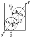 解: 各球受力情况如图. 球1受三力作用: 重力G、筒壁的压力N1、球2的压力F;球2受四力作用: 重力G、筒壁的压力N2、球1的压力F'(F'=F)及筒底支持力N3. 对球1, 由平衡条件得 F·cosα=N1 F·sinα=G,