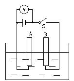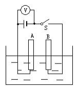 玻璃容器内盛有200g的KOH水溶液,溶质的质量占2%,A、B为两个铂电极.开始时开关S断开,电压表示数为6V,闭合开关S开始通电,电压表示变为4.8 V,经过8×104 s时间,断开S停止通电,溶液中溶质的质量占总量的2/55.求:电源内阻。![]()