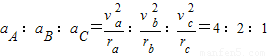 故ωA:ωB:ωC=rB:rA=2:1:1,故B错误;