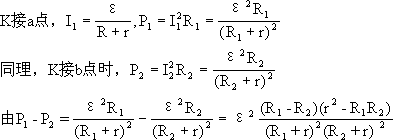 正确解答:当电键K接不同位置时,电路的结构不同. (1)当R1<R2时,若r2=R1R2P1-P2=0所以P1=P2;若r2<R1R2P1-P2<0所以P1<P2;若r2>RLR2P1-P2>0所以P1>P2 (2)当R1>R2时,若r2=R1R2P1-P2=0,所以P1=P2;若r2<R1R2 P1-P2>0所以P1>P2;若r2>R1R2P1-P2<0所以P1<P2 小结:解决电路问题先审题,审题过后有的同学头脑中出现许多公式,他从中选择合适的公式,有的同学则从头脑中搜寻以前做过的题目,看有没有与本题相似的题目,如果有相似的题目,就把那道题的解题方法照搬过来.这些方法不一定错,但是一旦问题比较复杂,或者题目叙述的是一个陌生的物理情境,这些方法就不好用了.所以,规范化的解题步骤是必不可少的. |