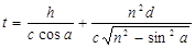 如图所示,平行玻璃砖折射率n,厚度d,距玻璃砖上表面h处的点光源P发出的光线以入射角α射入到玻璃内,然后从下表面射出。已知真空中光速为c,求光从P点出发传播到下表面所用的时间。![]()