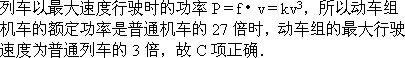 从合肥开往南京、上海的动车组开始运行,动车组的最大优点是列车的运行速度快.提高列车运行速度的一个关键技术问题是提高机车发动机的功率.动车组机车的额定功率是普通机车的27倍,已知匀速运动时,列车所受阻力与速度的平方成正比,即f=kv2,则动车组运行的最大速度是普通列车的
