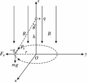 、方向竖直向下的匀强磁场,在(0,0,h)处固定一电量为+q(q>0)的点电荷,在xOy平面内有一质量为m、电量为-q的微粒绕原点O沿图示方向作匀速圆周运动。若微粒的圆周运动可以等效为环形电流,求此等效环形电流的电流强度I。(重力加速度为g)