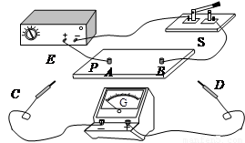 如图所示,E为直流电源,G为灵敏电流计,A、B为两个圆柱形电极,P是木板,C、D为两个探针,S为开关。现用上述实验器材进行“用描迹法画出电场中平面上的等势线”的实验。