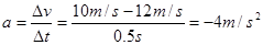 2012年伦敦奥运会100m冠军博尔特,在预赛跑的撞线前0.5秒内速度由12m/s减速至10m/s,其过程可以认为是匀变速直线运动,则在这0.5s内博尔特的加速度是_____.