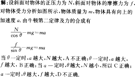 分析:本题考察受力分析和牛顿第二定律的应用,对物体准确受力分析,根据牛顿第二定律列出方程,分析θ、a的变化即可得出正确结论. |