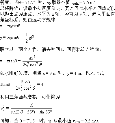 这是一道联系实际的题目,研究这类问题首先要建立物理模型——水枪射出的水的运动可看作斜抛运动.然后将水的运动分解为水平方向的匀速直线运动和竖直上抛运动,注意分析出水刚好过墙满足x=3,y=4的临界条件. |
