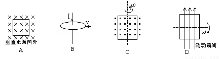 试题分析:A中当线圈垂直纸面向外运动时,线圈导线的运动方向与磁感线平行,不切割磁感线,故不产生感应电流,A不对;B中的通电直导线产生的磁场与直导线垂直,故穿过线圈的磁通量为0,当线圈运动时,穿过它的磁通量仍为0,没有变化,故不产生感应电流,B也不对;C在转动瞬间,线圈的左右两边不切割磁感线,穿过闭合线框的磁通量最大,变化率为零,故不产生感应电流,C是不对的;D中在转动的瞬间,线圈的两边切割磁感线运动,故产生感应电流,所以D是正确的。
