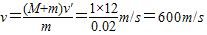 解答:解:根据动量守恒定律得,mv=(M+m)v′,解得