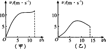 运动员是从静止开始起动的,其速度在较短时间内就能达到一个比较大的数值,然后一段时间内速度大小虽有波动,但变化不大,冲刺阶段速度还会增大一点.其v-t图可由图(甲)表示. 若没有受过训练的同学跑百米,其速度的最大值也小,另外还不能较长时间维持比较大的速度,其v-t图象可由图(乙)表示.