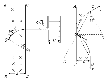 如图所示,在空间中存在垂直纸面向里的场强为B匀强磁场,其边界AB、CD的宽度为d,在左边界的Q点处有一质量为m,带电量为负q的粒子沿与左边界成30o的方向射入磁场,粒子重力不计.求: