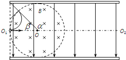(2)设粒子在磁场中做圆周运动的轨道半径为r,粒子恰好从上极板左边缘飞出时速度的偏转角为α,由几何关系可知:β=π-α=45°,r+