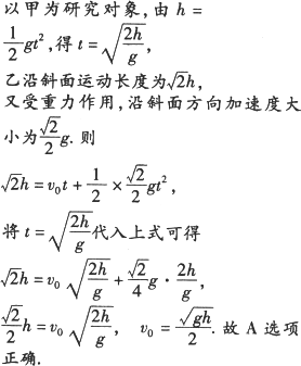 如图所示,离地面高h处有甲、乙两个小球,甲以初速度v0水平射出,同时乙以大小相同的初速度v0沿倾角为45°的光滑斜面滑下,若甲、乙同时到达地面,则v0的大小是