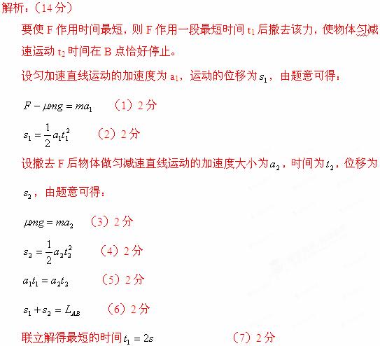 (2013陕西宝鸡期末质检)如图所示,水平地面上有A、B两点,且两点间距离LAB=15m,质量m=2kg的物体(可视为质点)静止在A点,为使物体运动到B点,现给物体施加一水平F =10N的拉力,求拉力F作用的最短时间。(已知地面与物块的滑动摩擦因数μ=0.2,g取10m/s2)