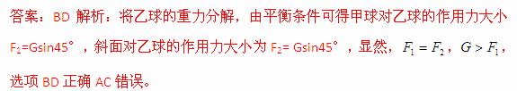 (2013西安摸底)如图所示,两个相同的光滑小球甲和乙放在倾角为45o的斜面上,被一固定在斜面上的竖直挡板挡住,设每个小球的重力大小为G,甲球对乙球的作用力大小为F1,斜面对乙球的作用力大小为F2,则以下结论正确的是 ( )