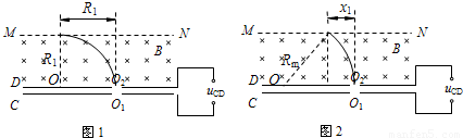 设恰能飞出磁场边界MN的带电粒子在电场中运动时CD两板间的电压为U1,从小孔O2进入磁场时的速度为v1,
