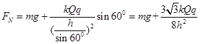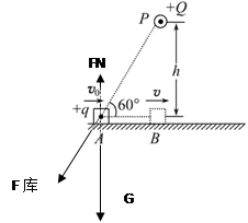 如图所示,在足够长的光滑绝缘水平直线轨道上方h高度的P点,固定电荷量为+Q的点电荷.一质量为m、带电荷量为+q的物块(可视为质点),从轨道上的A点以初速度v0沿轨道向右运动,当运动到P点正下方B点时速度为v.已知点电荷产生的电场在A点的电势为φ(取无穷远处电势为零),PA连线与水平轨道的夹角为60°,试求:![]()