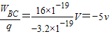 有一个带电量q=-3.2×10-19C的点电荷,从电场中的A点移到B点时,克服电场力做功12.8×10-19 J,从B点移到C点时,电场力做功16×10-19 J?求:(1)A、B、C三点之间的电势差UAB、UBC和UCA各是多少?