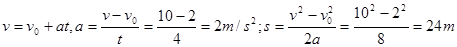 (6分)汽车做匀加速直线运动,经过4s的时间,速度由2m/s增加到10m/s,则汽车的加速度是_______m/s2,加速的距离为________m。