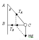 (2)小车向左加速度增大,AB、BC绳方向不变,所以AC绳拉力不变,BC绳拉力变大,BC绳拉力最大时,小车向左加速度最大,小球受力如图分)