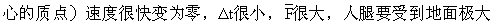 的作用力,很容易造成伤害.第二种情况下,由于着地后弯腿,人的重心还要向下移动较长距离,速度经过较长时间变为零,Δt较大,故地面对