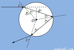 雨过天晴,人们常看到天空中出现彩虹,它是阳光照射到空气中弥漫的水珠上时出现的现象,在说明这个现象时,需要分析光线射入水珠后的光路。一细束光线射入水珠,水珠可视为一个半径为R的球,球心O到入射光线的垂直距离为d,水的折射率为n。 在图上画出该束光线射入水珠内经一次反射后又从水珠中射出的光路图,并求这束光线从射向水珠到射出水珠一次偏转的角度(用反三角函数表示)。