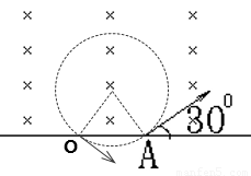 有一带电量为+q,质量为m的带电粒子,沿如图所示的方向,从A点沿着与边界夹角300、并且垂直磁场的方向,进入到磁感应强度为B的匀强磁场中,已知磁场的上部没有边界,若离子的速度为v,则该粒子离开磁场时,距离A点的距离( )