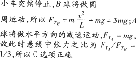 如图所示,将完全相同的两小球A、B用长L=0.8 m的细绳悬于以v=4 m/s向左匀速运动的小车顶部,两球分别与小车前后壁接触.由于某种原因,小车突然停止,此时悬线中张力之比