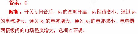(2013北京西城期末)如图所示,电路中RT为热敏电阻,R1和R2为定值电阻。当温度升高时,RT阻值变小。开关S闭合后,RT的温度升高,则下列物理量中变小的是