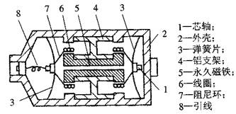 试题分析:图是动圈式振动速度传感器的结构示意图。其结构主要特点是,钢制圆形外壳,里面用铝支架将圆柱形永久磁铁与外壳固定成一体,永久磁铁中间有一个小孔,穿过小孔的芯轴两端架起线圈和阻尼环,芯轴两端通过圆形膜片支撑架空且与外壳相连。工作时,传感器与被测物体刚性连接,当物体振动时,传感器外壳和永久磁铁随之振动,而架空的芯轴、线圈和阻尼环因惯性而不随之振动。因而,磁路空隙中的线圈切割磁力线而产生的正比于振动速度的感应电动势,线圈的输出通过引线输出到测量电路。