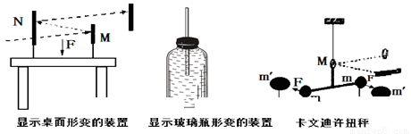 试题分析:第一个实验是通过桌面受力发生形变,但是这种形变不明显不易观察,当桌面发生微小形变时,桌面上的两个平面镜会发生倾斜,从而使得反射光线的方向发生改变,最终反射光在墙壁上的光点发生移动,从而判断桌面发生了形变。玻璃瓶受力发生形变同样不明显,灌满水封闭瓶口后通过插入细管内液面的升降也可把这种不明显的形变变得易于观察。第三个实验是卡文迪许测量万有引力常量的扭秤装置,通过万有引力的作用使得金属丝扭转带动平面镜转动,使得发射光发生偏转,三个实验共同之处都把不明显不以观察的物理量变为易于观察,因此是放大的思想方法。选项B对。