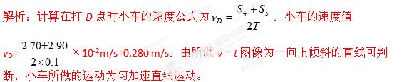 ①如果测得C、D两点间距S4=2.70cm,D、E两点间距S5=2.90cm,则据此数据计算在打D点时小车的速度公式为 ,小车的速度值vD= m/s。(保留三位有效数字)