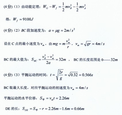 ÈçͼËùʾΪijÓéÀÖ³¡µÄ»¬µÀʾÒâͼ£¬ÆäÖÐABΪÇúÃæ»¬µÀ£¬BCΪˮƽ»¬µÀ£¬Ë®Æ½»¬µÀBCÓë°ë¾¶Îª1£®6mµÄ1£¯4Ô²»¡»¬µÀCDÏàÇУ¬DEΪ·ÅÔÚˮƽµØÃæÉϵĺ£Ãàµæ¡£Ä³ÈË´ÓÆÂ¶¥»¬Ï£¬¾¹ý¸ß¶È²îΪ20mµÄAµãºÍBµãʱµÄËÙ¶È·Ö±ðΪ2m/sºÍ12m/s£¬ÔÚCµã×öƽÅ×Ô˶¯£¬×îºóÂäÔÚº£ÃàµæÉÏEµã¡£È˵ÄÖÊÁ¿Îª70kg£¬ÔÚBC¶ÎµÄ¶¯Ä¦²ÁÒòÊýΪ0£®2¡£ÎÊ£º