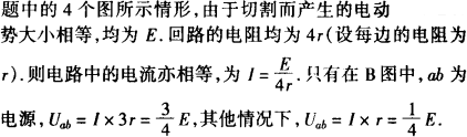 粗细均匀的电阻丝围成的正方形线框置于有界匀强磁场,磁场方向垂直于线框平面,其边界与正方形线框的边平行.现使线框以同样大小的速度沿四个不同方向平移出磁场,如图所示,则在移出过程中线框的一边a、b两点间的电势差绝对值最大的是