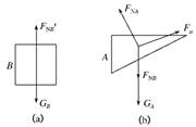【解析】以A为研究对象,根据力的产生条件 ,可知它受到重力GA作用;由于它与B和斜面相互接触并挤压,于是受到B的压力FNB和斜面支持力FNA的作用;又因物体A沿斜面匀速下滑,所以它的下表面还受到斜面对它的摩擦力Fμ,那么A的上表面是否受摩擦力作用?这从A物体的受力及运动状态难以作出判断(为什么?),我们可以转换思路,以B为研究对象,它与A一起做匀速运动,因此,它只可能受到竖直方向的重力GB和支持力FNB′这一对平衡力作用,不可能在水平方向上再受到摩擦力作用,如下图(a)所示,由力的作用的相互性可知,A对B无摩擦力作用,则B对A也无摩擦力作用,所以物体A共受四个力作用,其受力图如下图(b)所示.
