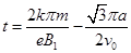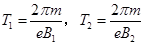 设电子在y轴右侧和左侧做圆周运动的周期分别为T1和T2, 则
