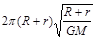 天宫一号目标飞行器在地球轨道上作匀速圆周运动,离地高度为r,已知地球质量为M,地球半径为R,万有引力恒量为G,它绕地球一周的时间为____________;当神舟八号飞船关闭发动机与天宫一号对接时,飞船的加速度为____________。