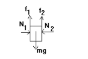 解: 如图, 砖块受到五力作用: 重力mg, 压力N1、N2, 摩擦力f1、f2. (1)砖块作匀速运动时, 设钳口对砖块的压力至少为N, 由平衡条件得, mg=2f=2μ N (2)吊臂突然停止时, 砖块作圆周运动. 设钳口对砖块的压力至少为N',摩擦力f'=μN'.
