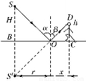解:水平面相当于平面镜,作光路图如图如示,若人在某位置时恰 能通过水池的边缘看到灯在水中的像,这时光源发出的光恰好通过水池边缘反射入人的眼睛,