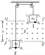 如图所示,一正方形平面导线框a1b1c1d1,经一条不可伸长的绝缘轻绳与另一正方形平面导线框a2b2c2d2相连,轻绳绕过两等高的轻滑轮,不计绳与滑轮间的摩擦.两线框位于同一竖直平面内,a1d1边和a2d2边是水平的.两线框之间的空间有一匀强磁场区域,该区域的上、下边界MN和PQ均与a1d1边及a2d2边平行,两边界间的距离为h=78.40cm.磁场方向垂直线框平面向里.已知两线框的边长均为l=40.00cm,线框a1b1c1d1的质量为m1=0.40kg,电阻为R1=0.80Ω.线框a2b2c2d2的质量为m2=0.20kg,电阻为R2=0.40Ω.现让两线框在磁场外某处开始释放,两线框恰好同时以速度v=1.20m/s匀速地进入磁场区域,不计空气阻力,重力加速度取g=10m/s2.求:(1)在图25上标出两线框同时进入磁场时,线框a1b1c1d1中的感应电流方向和线框a2b2c2d2所受到的安培力的方向;