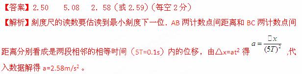 (2013山东寿光市质检)如图是物体做匀变速直线运动纸带的一部分,已知所用打点计时器的周期T=0.02s,A、B、C分别是三个记数点,每两个记数点间有四个记时点未画出,纸带下方是一把毫米刻度尺。则由纸带和刻度尺可知:A与B之间的距离为 cm,B与C之间的距离为 cm,该匀变速直线运动的加速度是a= m/s2。